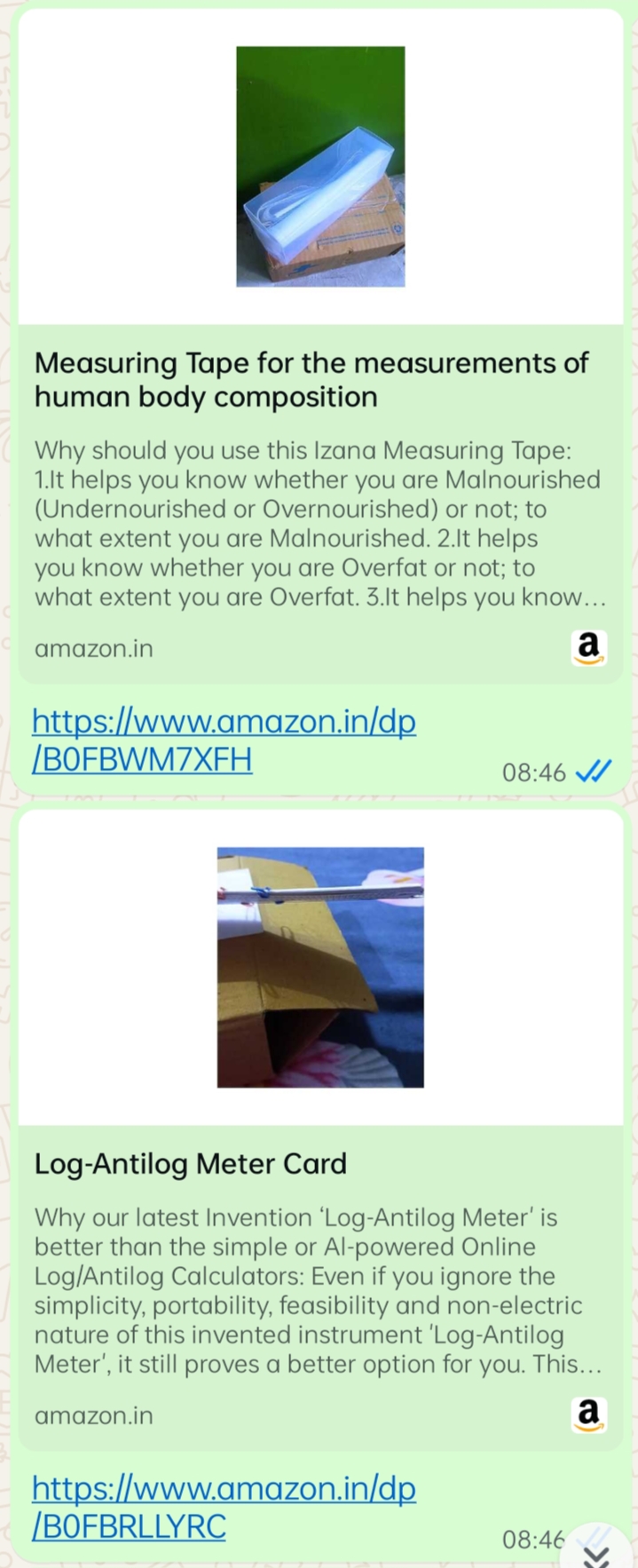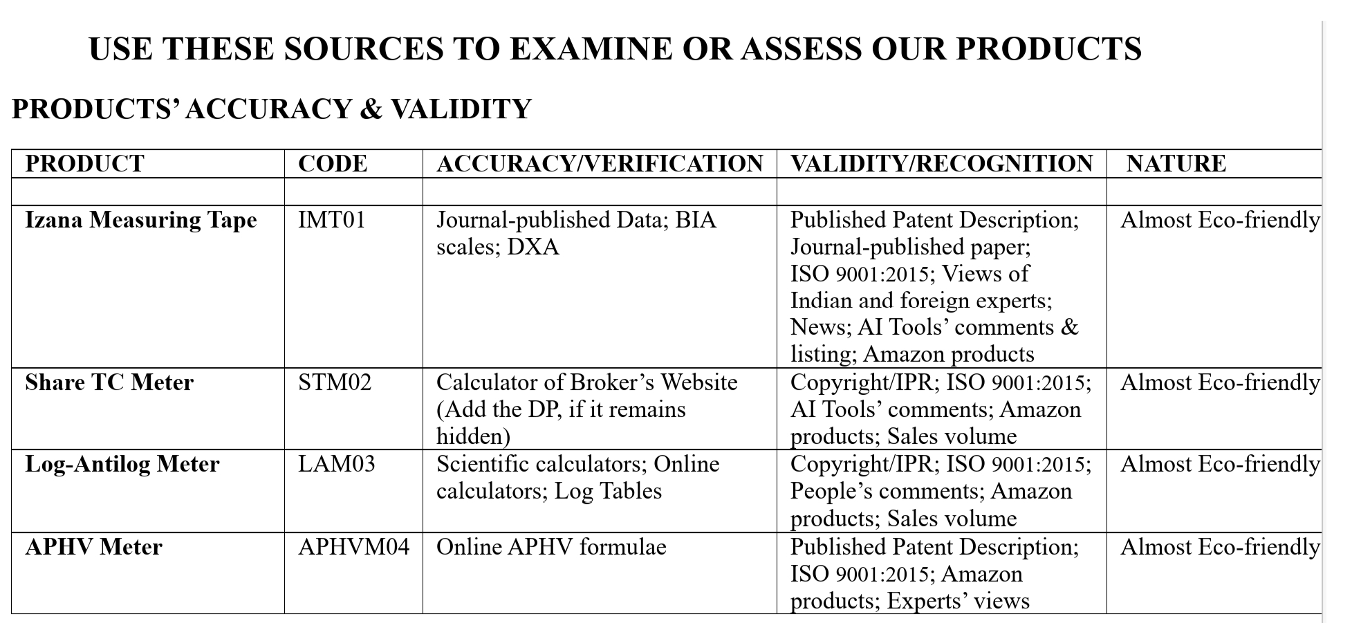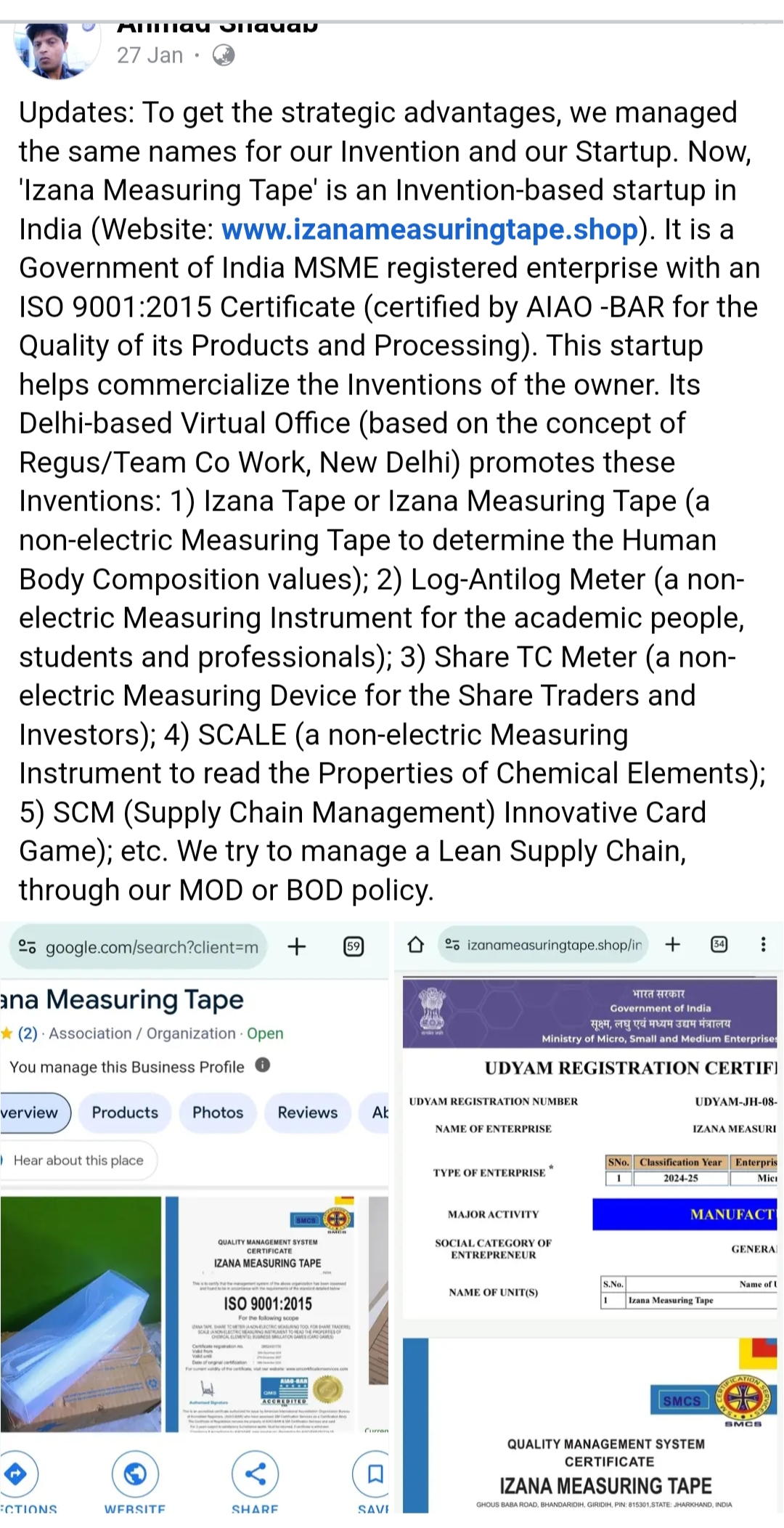 About Us What the Claude AI says about our Invented Products Our Strategy and Products Invitations from Ministry of MSME Greetings from AIMA, Ministry of Corporate Affairs, Government of India Invitation from CBER, UK Invitation from Institute of Directors (IOD) Invitation from Amity University Certifications We respect the Legal Metrology Rules What the Business Organizations and people say about Our Inventions Appreciation Mail from the Stanford University Response from other Organizations About our Startup, what the Chinese AI 'DeepSeek' says and analyzes Use these sources to examine or assess our Products Our Inventions Our invention 'Izana Tape' or 'Izana Measuring Tape' Our Invention 'Log-Antilog Meter' (a rough picture for example) Our Invention 'APHV Meter' Inventor with his invention 'Share TC Meter' (a rough picture for example) A rough picture of our invention 'SCALE', a Measuring Instrument We are on Amazon