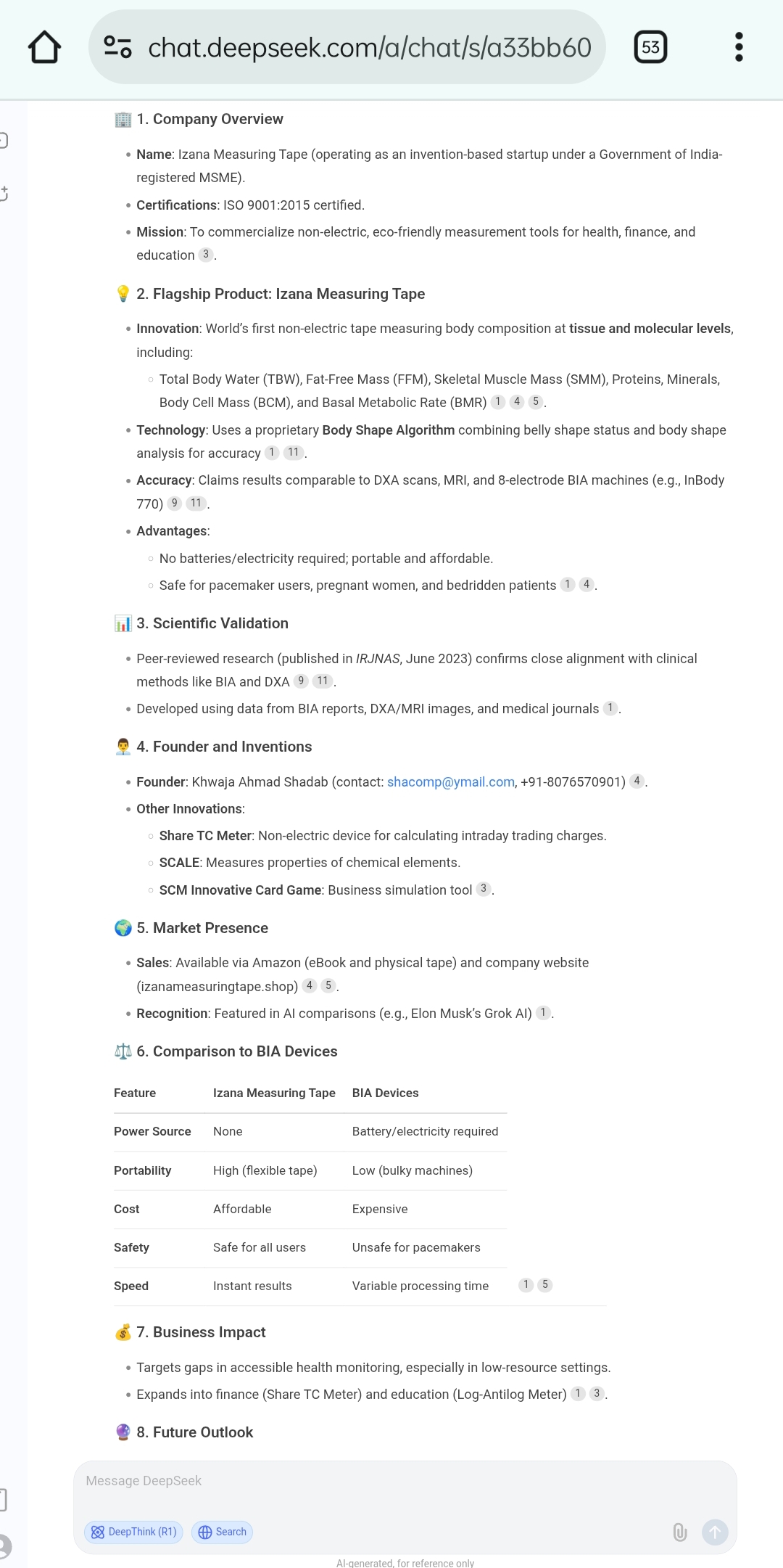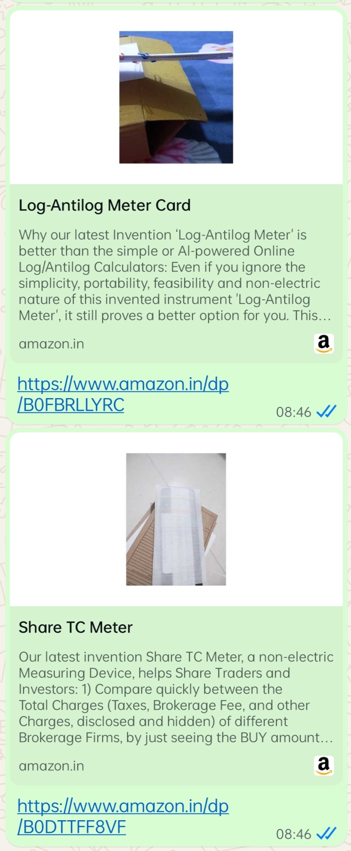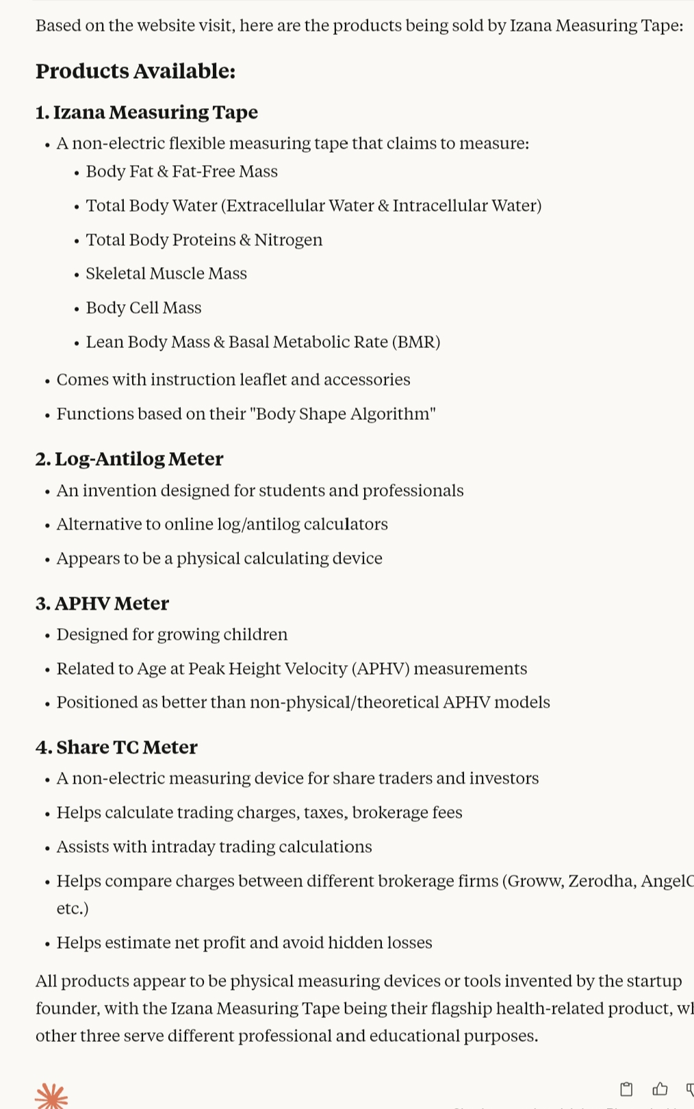 About Us What the Claude AI says about our Invented Products Our Strategy and Products Invitations from Ministry of MSME Greetings from AIMA, Ministry of Corporate Affairs, Government of India Invitation from CBER, UK Invitation from Institute of Directors (IOD) Invitation from Amity University Certifications We respect the Legal Metrology Rules What the Business Organizations and people say about Our Inventions Appreciation Mail from the Stanford University Response from other Organizations About our Startup, what the Chinese AI 'DeepSeek' says and analyzes Use these sources to examine or assess our Products Our Inventions Our invention 'Izana Tape' or 'Izana Measuring Tape' Our Invention 'Log-Antilog Meter' (a rough picture for example) Our Invention 'APHV Meter' Inventor with his invention 'Share TC Meter' (a rough picture for example) A rough picture of our invention 'SCALE', a Measuring Instrument We are on Amazon